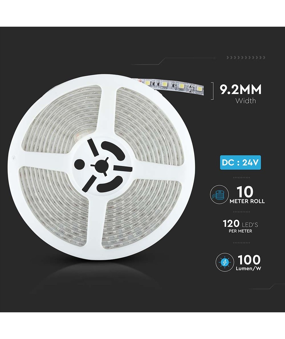 Ge dina utrymmen ett fantastiskt ljussken med denna moderna LED-stripbelysning. Denna belysning erbjuder 120 LED-per-meter och har en total effekt på 8W per meter, vilket ger en stark och effektiv belysningslösning med jämn ljusfördelning.