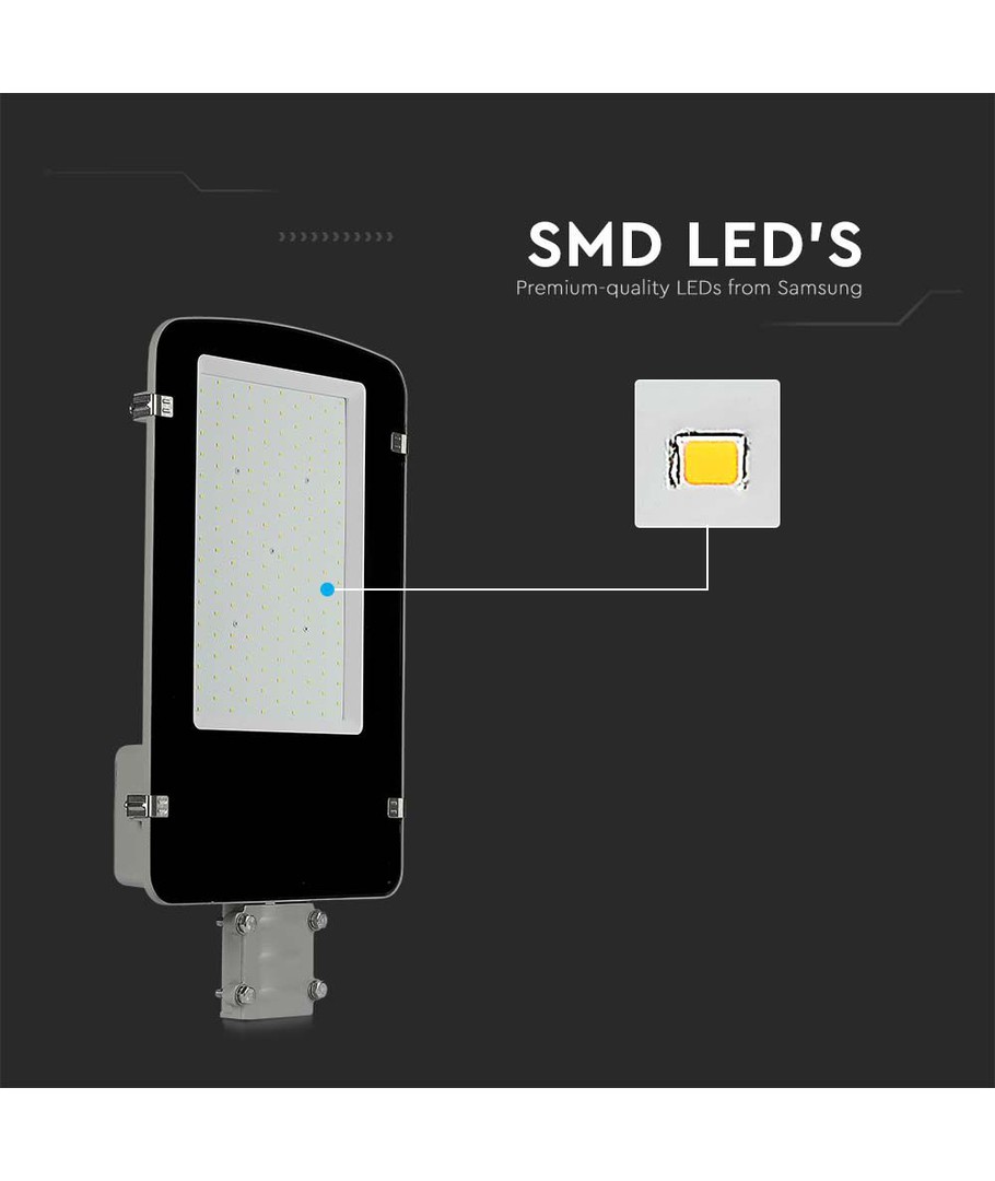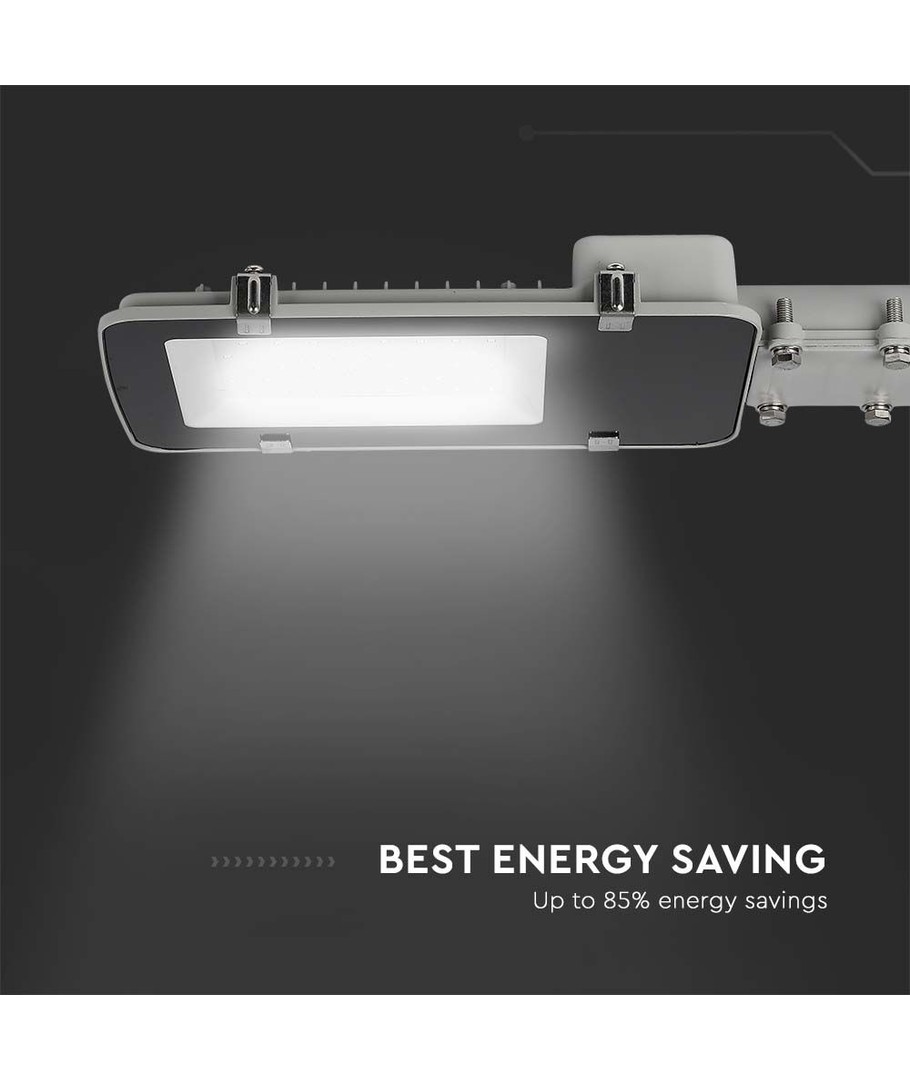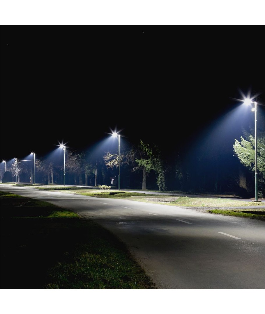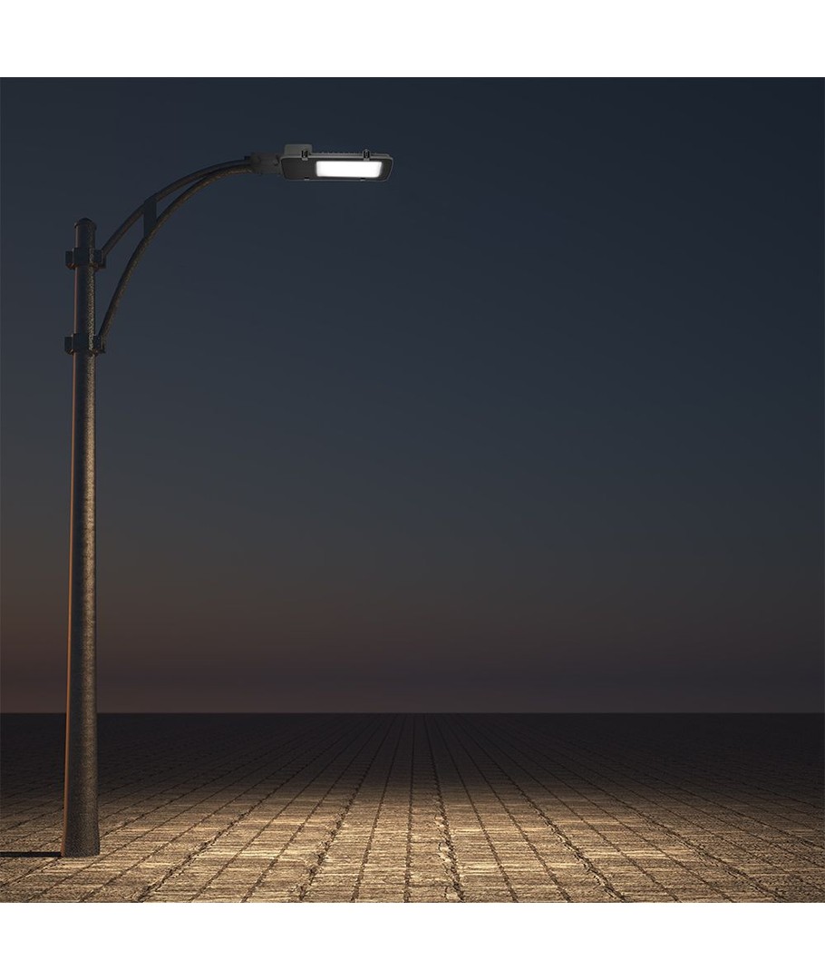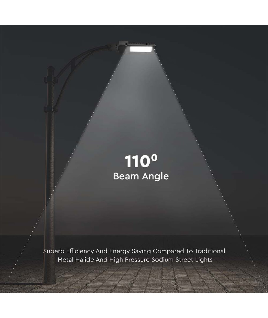 Denna gatlykta erbjuder 100W effekt och en ljusstyrka på 10000 lm, vilket garanterar en stark och jämn belysning. Med en bred ljusspridning på 110 grader kan du räkna med optimal ljusfördelning över större ytor.