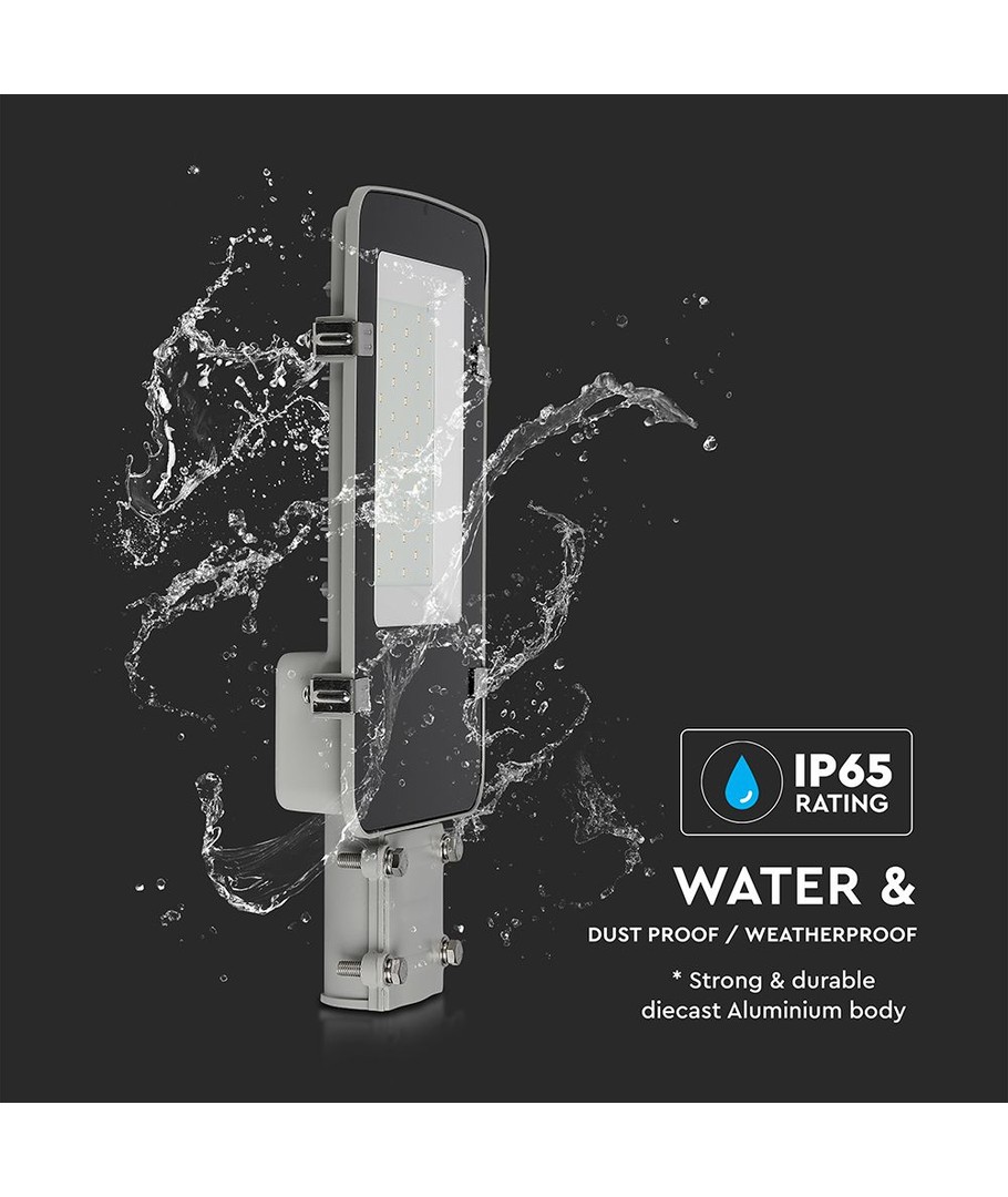 Denna ljuskälla har ett stilrent grått hölje och är utformad för att klara av tuffa miljöer med IP65-klassning, vilket gör den idealisk för utomhusbruk där den tål både vattenstänk och regn.