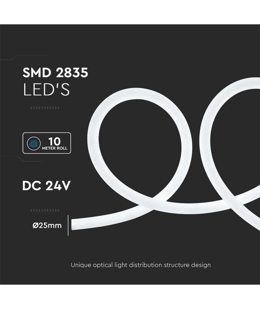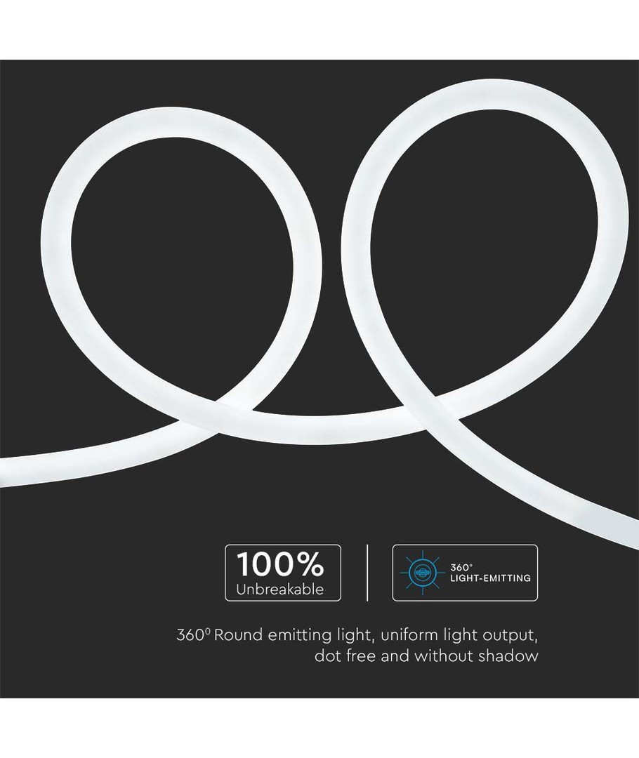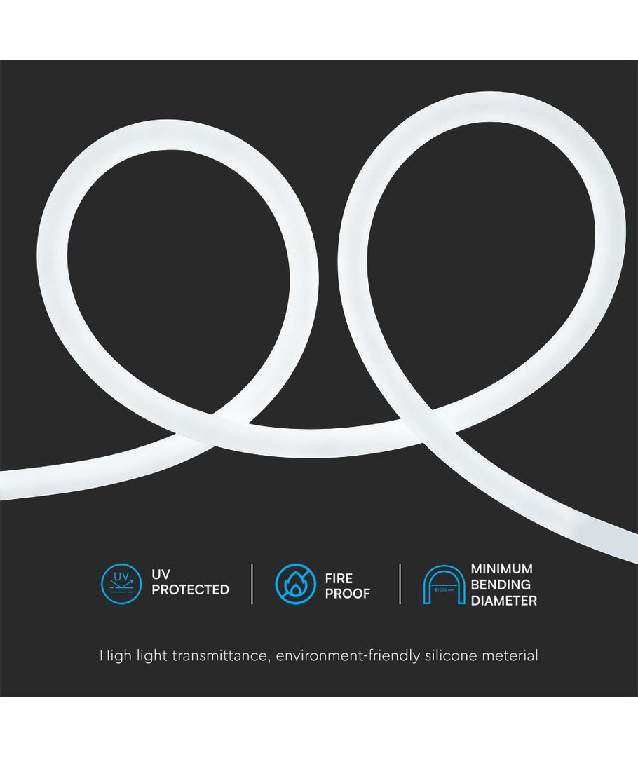 Denna 12W/m Neon Flex erbjuder en unik belysningslösning för de som söker en speciell touch i sina projekt. Neon Flex finns i kallvit (6500K), vilket innebär att den avger ett svalt ljus med en tydlig blåaktig nyans.