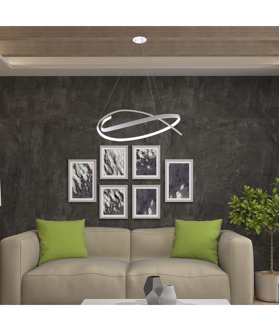 Designad för att passa moderna interiörer, är lampan tillverkad i metall med en elegant vit finish. Dimensionerna är 1200 x 900 mm, vilket gör den till en perfekt mittpunkt över matsalsbordet eller i vardagsrummet.