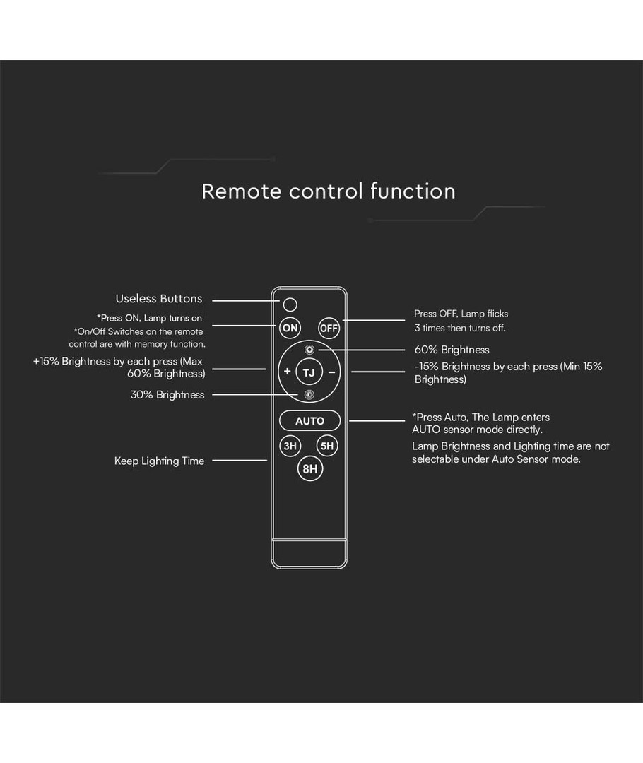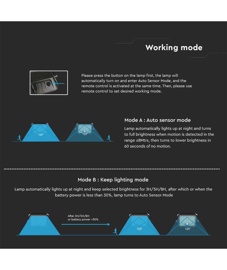 | Yderligere bemærkninger | Wire length: 5m. Battery: 6.4V, 6000mAh LiFePO4 Battery. Charging time: 4-6 Hours Sunlight Charging. Working time: Max.60 Hours. Sensor type: PIR. Sensor distance: |