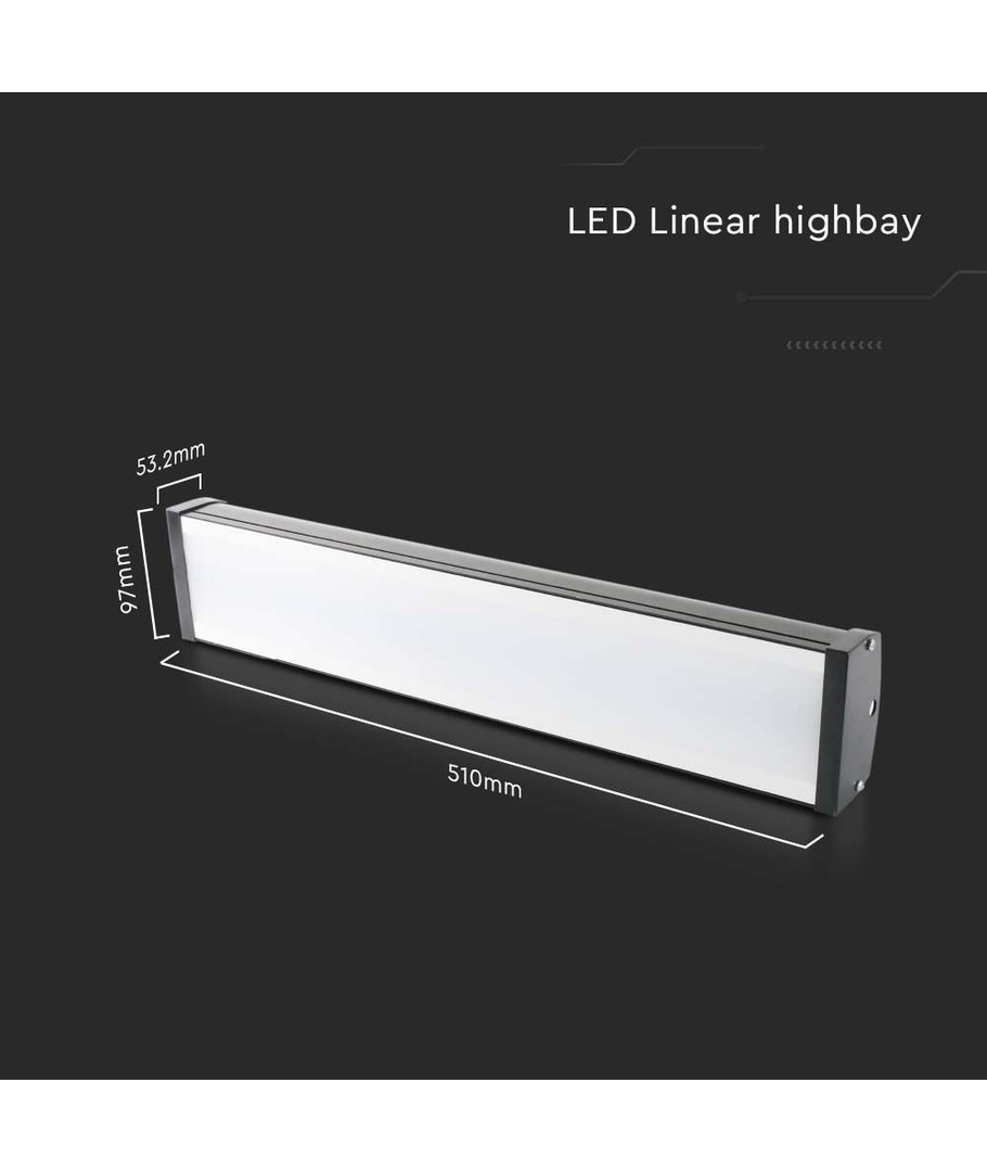 Lampans robusta design gör den idealisk för såväl inomhus- som utomhusbruk. Med ett IP65-skydd klarar den av både vattenstänk och regn, vilket gör den lämplig för installation i krävande miljöer. Dess dimensioner är 510 x 53.2 x 97 mm.