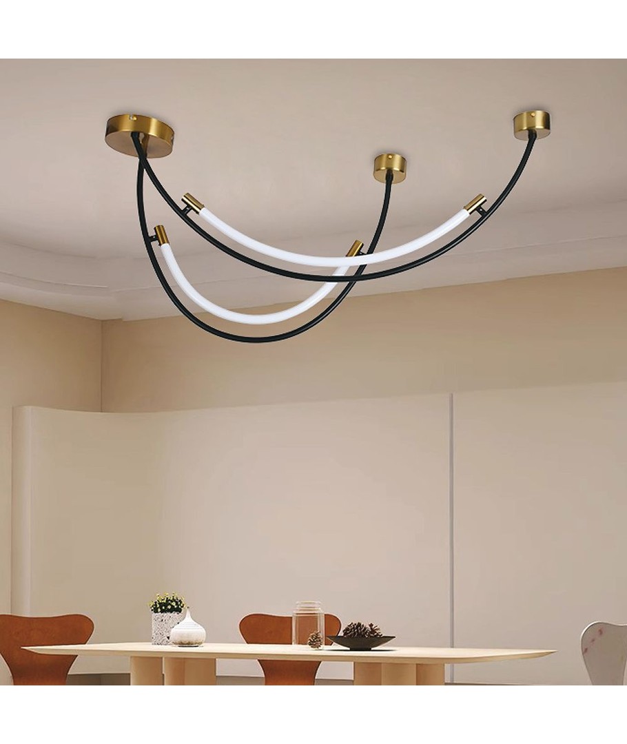 Den eleganta designen kombinerar svart och mässing, vilket ger en sofistikerad touch till alla rum. Lampan är 1000 mm lång och 600 mm hög, vilket gör den till en perfekt statement-pjäs i ditt vardagsrum eller matsal.