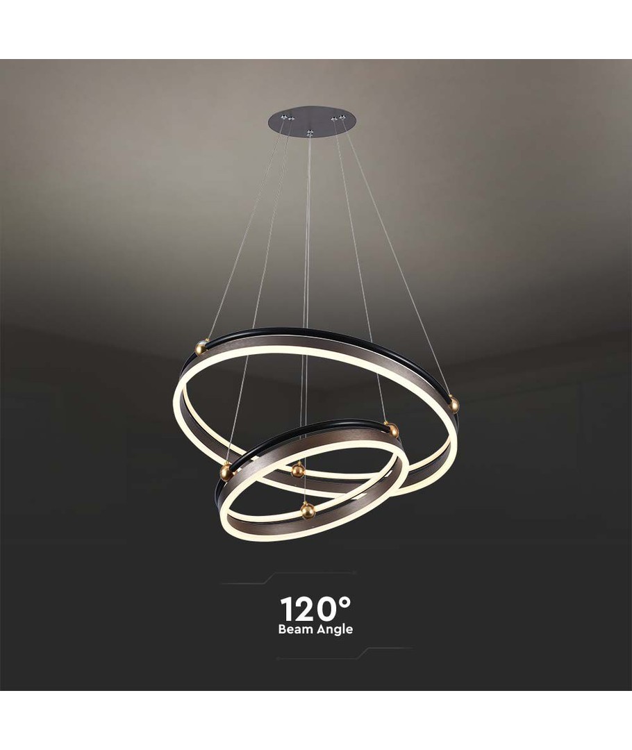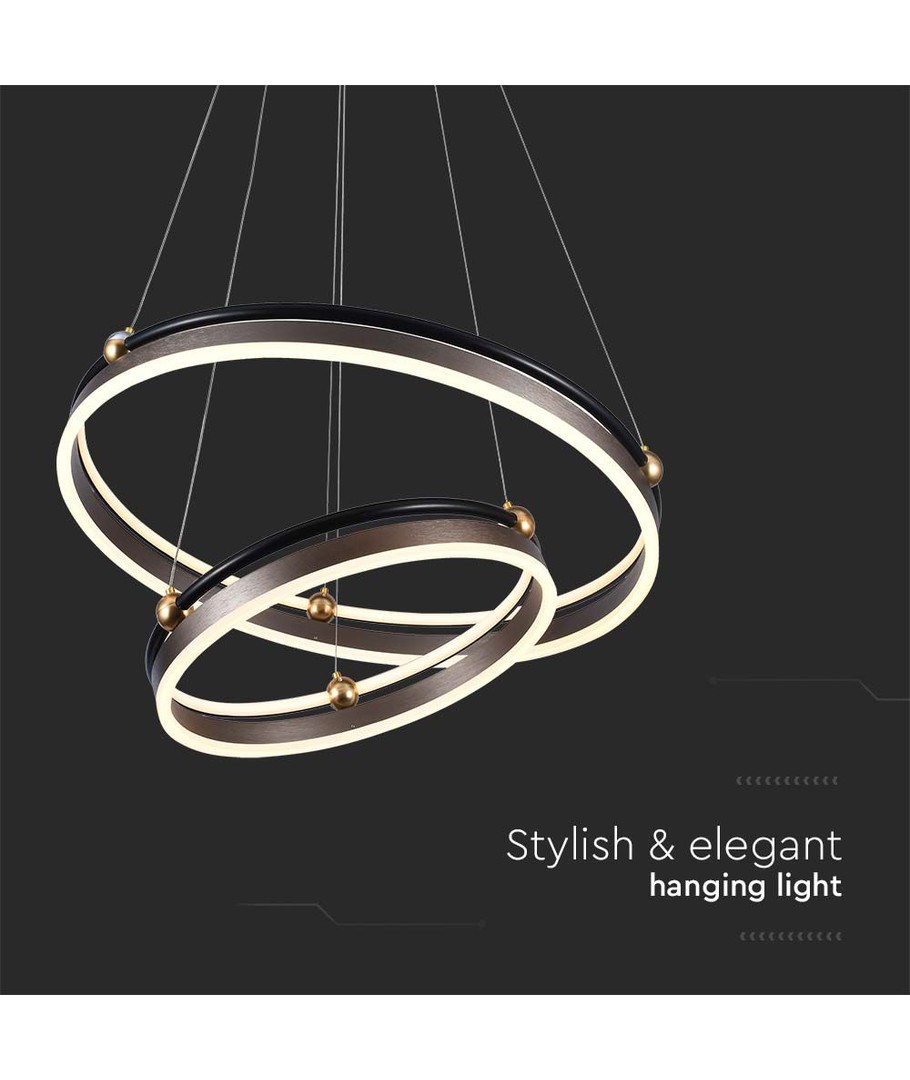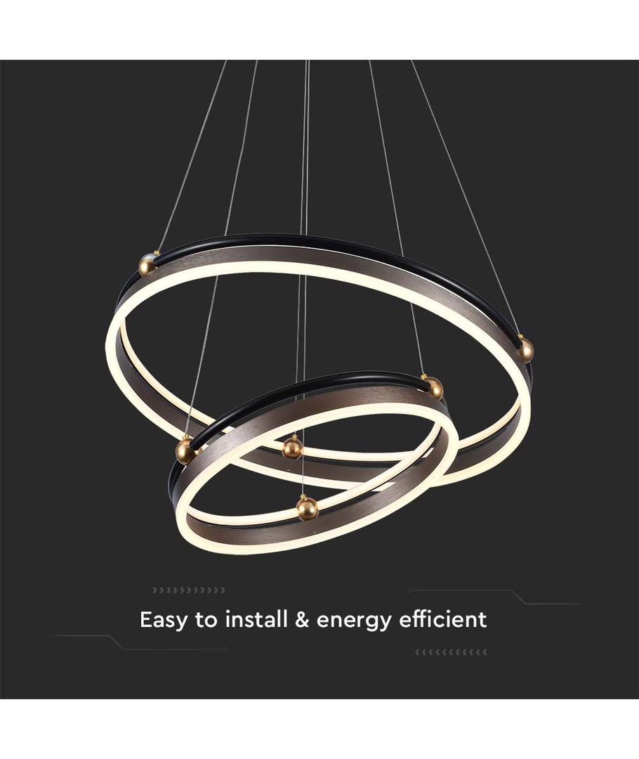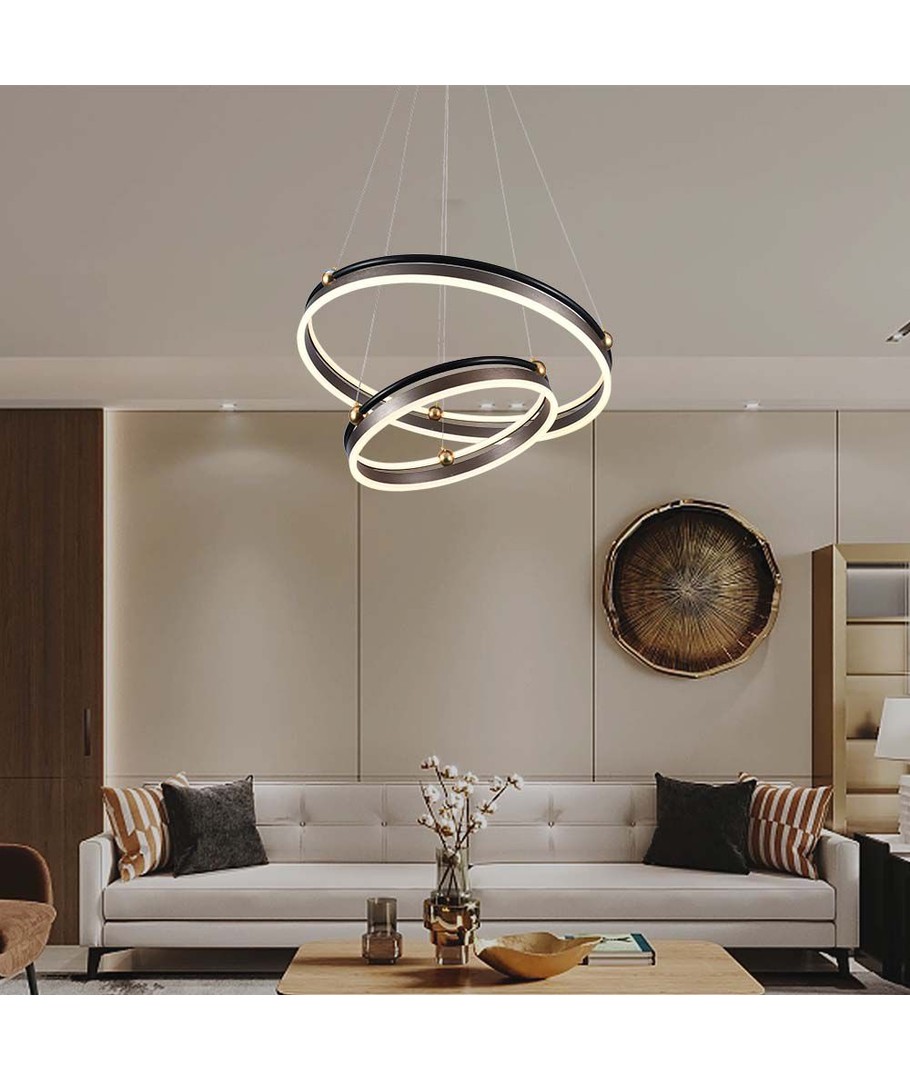 Med måtten 1100 x 625 mm passar denna lampa perfekt till både små och stora rum. Dess eleganta kaffefinish och dubbelringsdesign gör den till ett blickfång i varje rum.