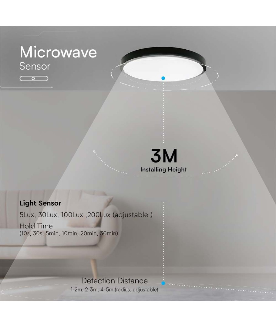 Denna lampa är utrustad med en mikrovågssensor som tillför bekvämlighet och energieffektivitet. Tack vare dess IP44-klassning, är lampan skyddad mot fukt och vattenstänk, vilket gör den idealisk för installation i lokaler som badrum och kök.