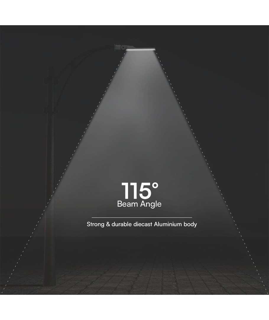 Denna kraftfulla LED gatubelysning är utvecklad för att säkerställa jämn och effektiv ljusfördelning, med ett imponerande ljusflöde på 20250 lumen. Den breda spridningsvinkeln på 115 grader gör den perfekt för att lysa upp stora områden.