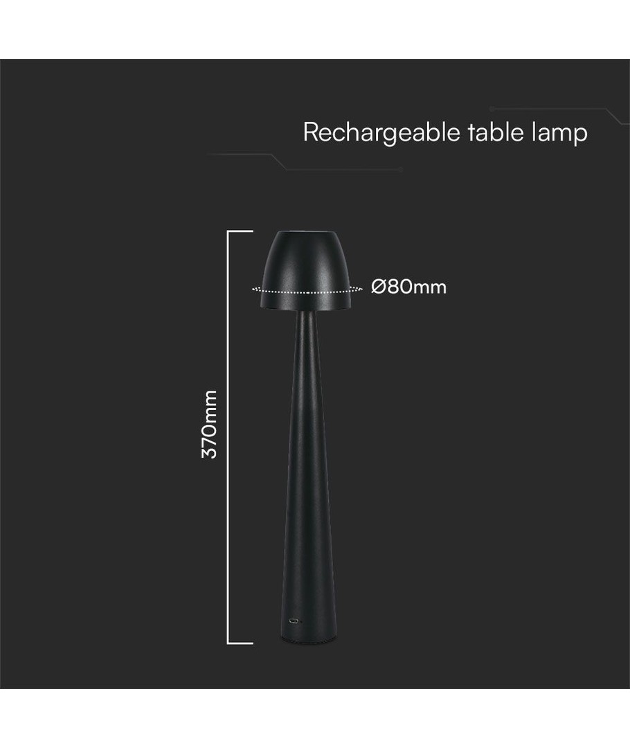 Färgen svart ger lampan ett tidlöst utseende som enkelt kan kombineras med olika inredningsstilar. Den kompakta designen på 370 mm i höjd och 80 mm i diameter gör den dessutom lättplacerad, även i trängre utrymmen som hyllor eller sidobord.