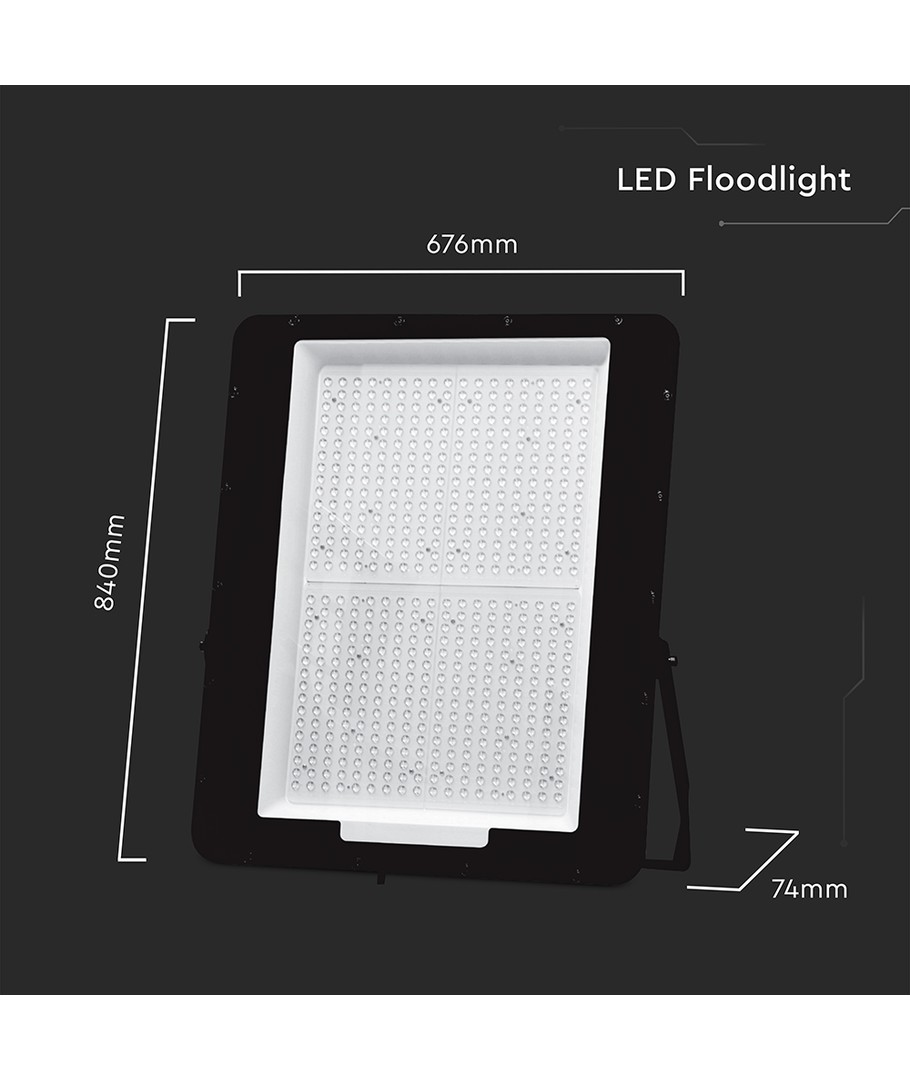 Den medföljande 1m kabeln gör installationen smidig och flexibel. Strålkastaren har dimensionerna 840 x 74 x 676 mm, vilket gör den kraftfull men ändå kompakt nog för att passa på olika platser.