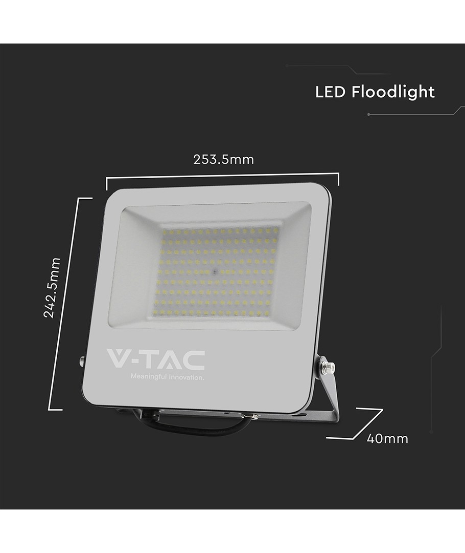 Strålkastaren har ett elegant svart hölje med grått glas och mäter 253.5 x 40 x 242.5 mm. Den är byggd för att tåla tuffa förhållanden med en IP65-klassificering, vilket innebär att den är skyddad mot vattenstänk och regn, perfekt för utomhusbruk.