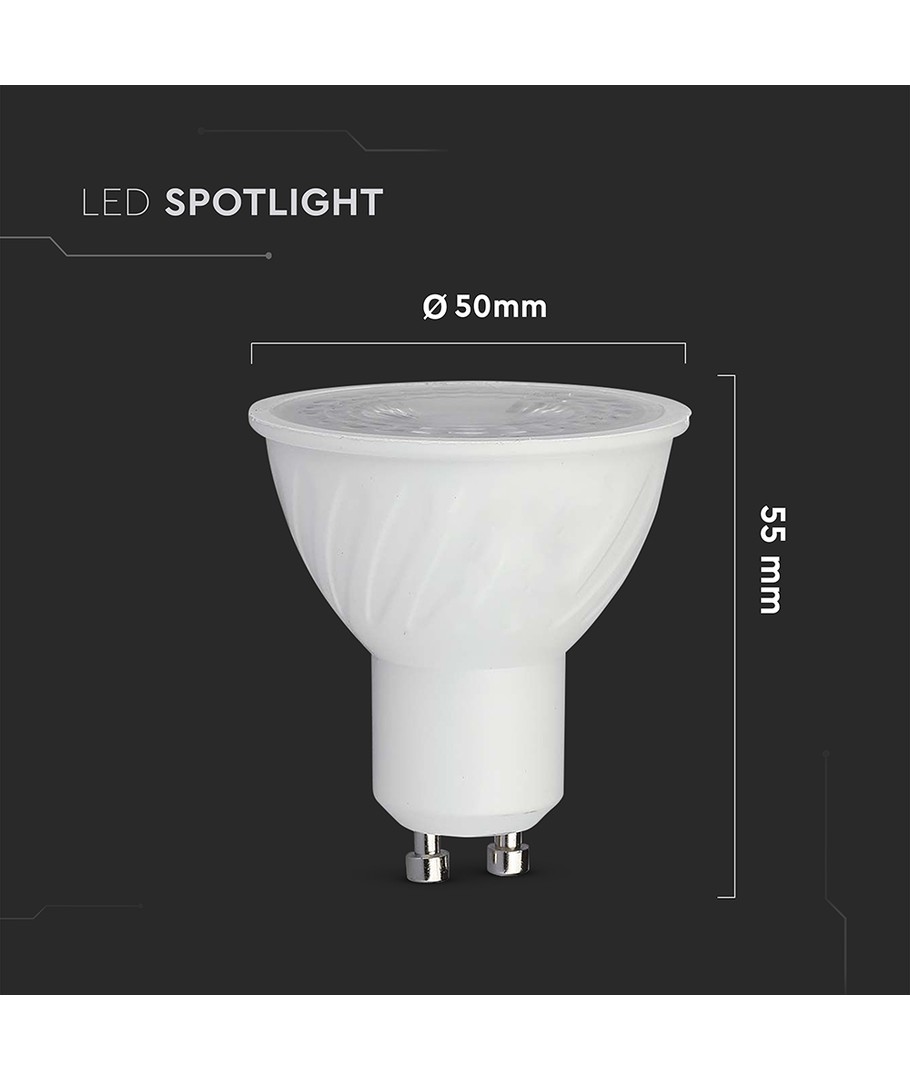 Denna spotlight erbjuder en effekt på 6W och är utrustad med en GU10-sockel, vilket gör den kompatibel med många armaturer. Med sin ljusstyrka på 445 lumen och breda spridningsvinkel på 110 grader säkerställs en jämn fördelning av ljuset som passar de flesta utrymmen.