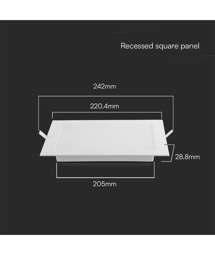 Panelens dimensioner är 220.4 x 28.8 x 220.4 mm, vilket gör den lätt att integrera i olika inomhusmiljöer. Dess slimmade profil passar väl in i moderna designkoncept.