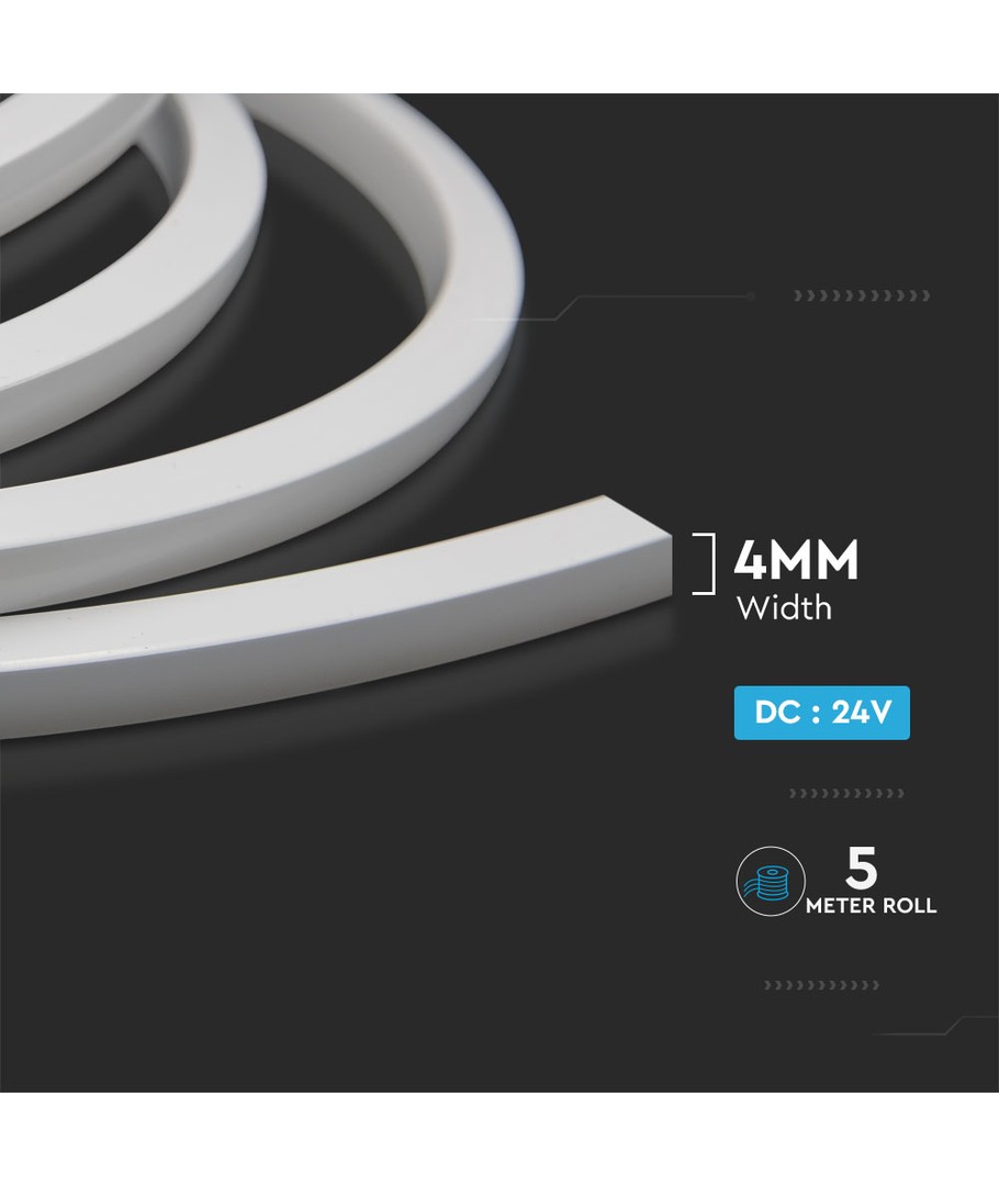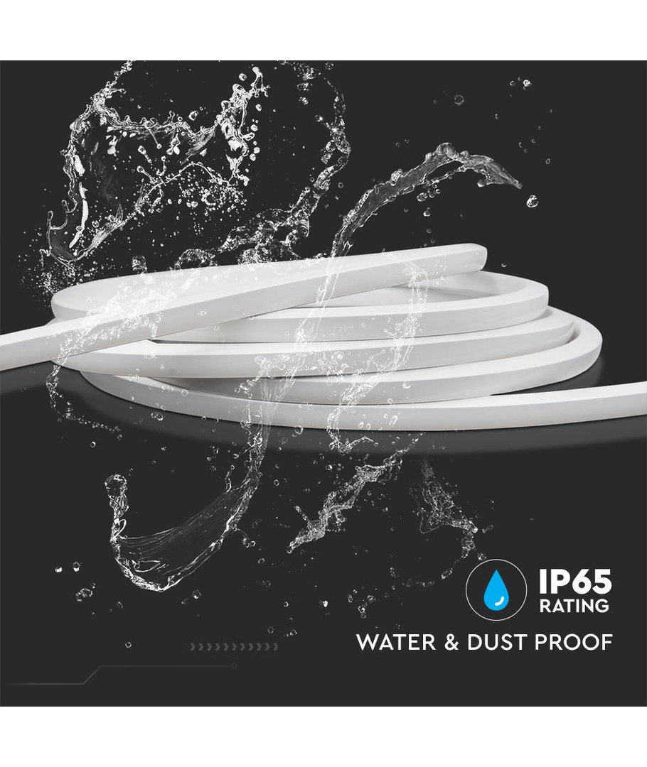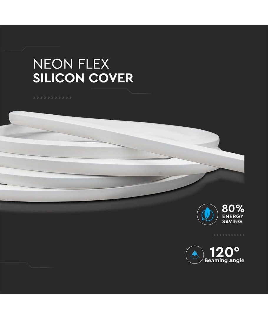 VT-560 Neon flex är täckt med flexibelt silikon och har en smidig dimension på 4 mm. Den är designad för en bred spridning på 120 grader, vilket ger en jämn och behaglig ljusfördelning.