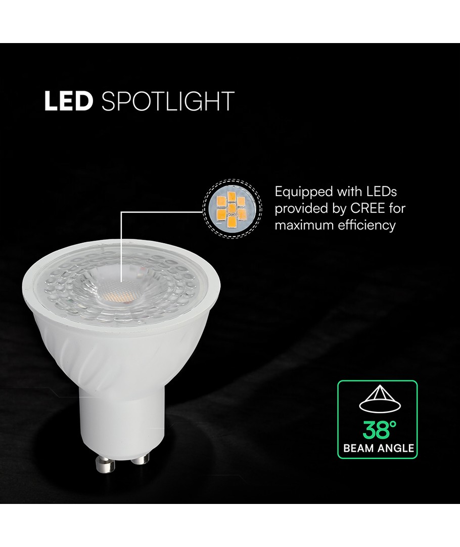 Med en effekt på 6W och GU10-sockel är detta spotljus både effektivt och enkelt att installera. Det har en ljusstyrka på 445 lumen, vilket ger ett starkt men samtidigt kontrollerat ljus tack vare en strålvinkel på 38 grader.