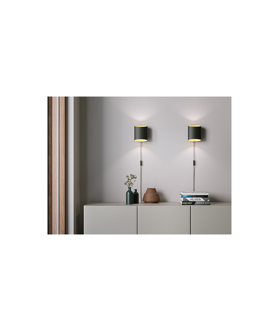 Snygg, svart vägglampa med en inre beklädnad i mässing, samt en sockel för G9-lampa, som lyser både uppåt och nedåt.