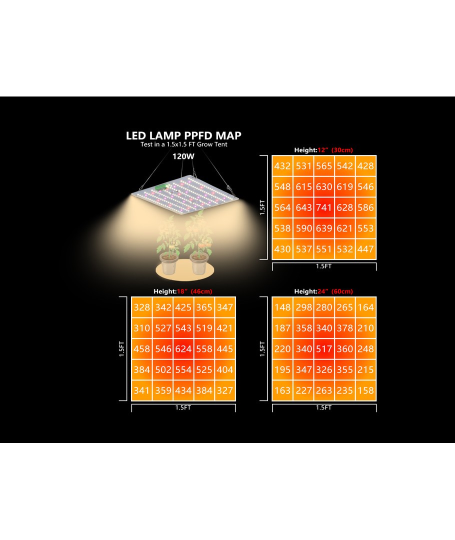 PAR (center värde): | 620 ppfd 30cm 580 ppfd 45cm 410 ppfd 60cm |