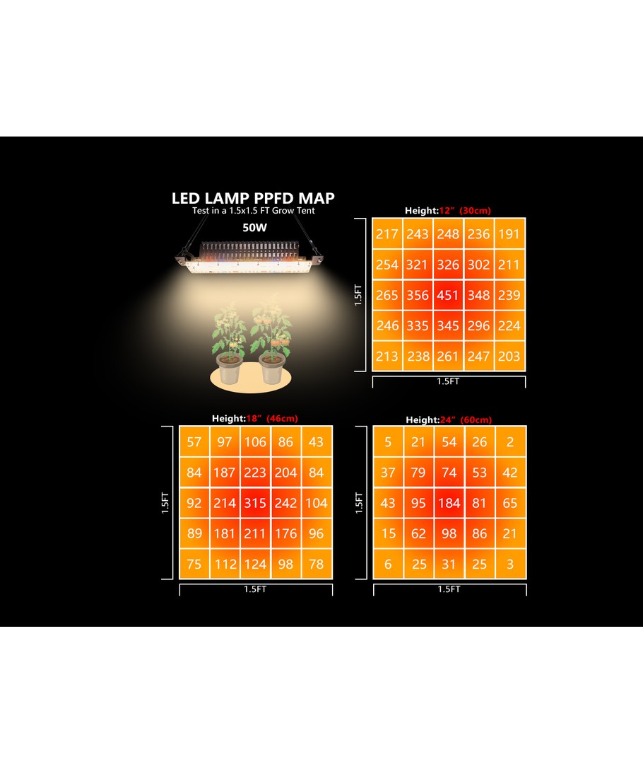 PAR (centralt värde): | 451 ppfd 30cm 315 ppfd 46cm 184 60 cm |