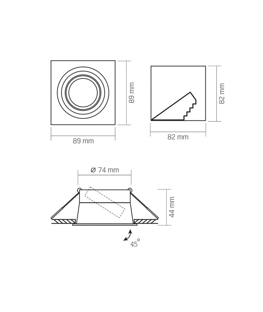 Den inbyggda spotlightens nätta mått med dimensionen på 92 x 92 x 46 mm gör att den passar in i mindre utrymmen utan att vara påträngande. Det krävs ett hål med en diameter på 77 mm för att installera denna spotlight.